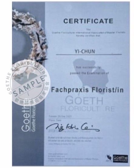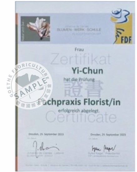 德國IHK工商總會 / 經濟辦事處證書 / 德國FDF花協職業證書 / Goethe Floriculture 歌德國際花藝設計學院證書 / 德國BWS花藝設計學院證書 / 德國環保中心證書